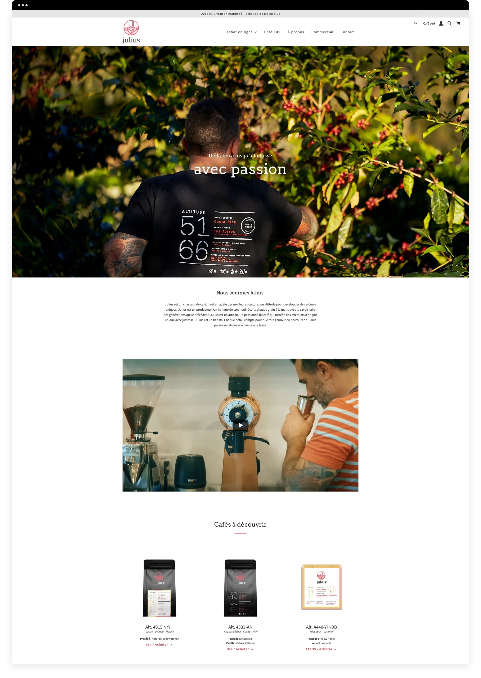 Ayant eu le mandat de développer la stratégie et l’identité de marque pour Julius, ZEN s’est donné comme objectif bien précis de véhiculer à même l’identité visuelle, la démarche à contre-courant du fondateur, la traçabilité des produits ainsi que la pratique éthique de la finca jusqu’à la tasse.