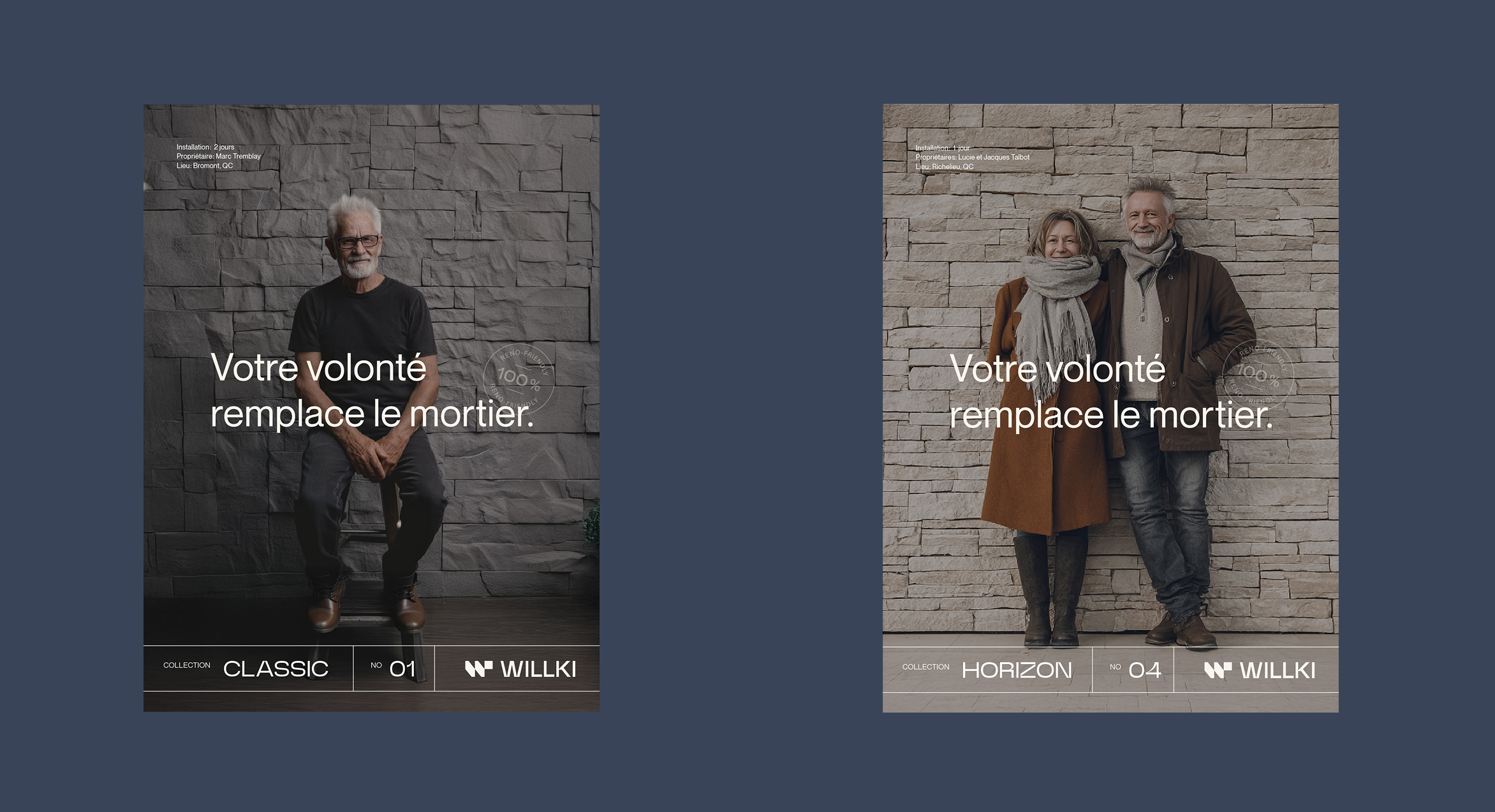 Dans le cadre de notre mandat, il était important de transposer les valeurs fondamentales de la compagnie au sein d’une identité visuelle et narrative cohérente. Entreprise québécoise engagée, Willki propose des panneaux de pierre composés à plus de 70 % de matériaux recyclés. Ensemble, nous avons contribué à positionner Willki comme une marque innovante, alliant responsabilité environnementale, excellence technique et valorisation de l’humain à travers ses employés.